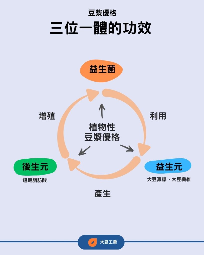 豆漿優格,同時有益生菌、益生元、與後生元,三位一體更有利於人體健康。