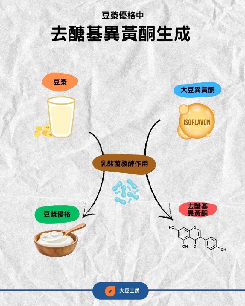 以豆漿優格中乳酸菌為例,依菌株種類不同,研究發現,能提高5~20倍去醣基異黃酮含量。
